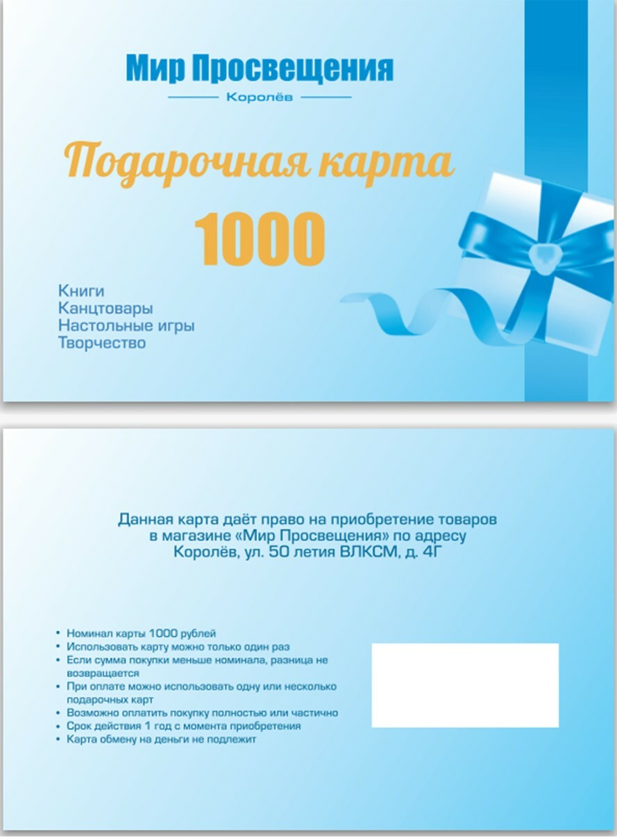 В нашем магазине Вы можете приобрести подарочную карту номиналом 1000 рублей. Карта станет отличным подарком для любого жителя города Королёва. Карту можно использовать для приобретения любого товара из нашего ассортимента. У нас вы найдете канцтовары от мировых лидеров, товары для художников и творчества, книги, учебную литературу, паззлы, большую коллекцию настольных игр (настольные игры для детей и для всей семьи, игры для вечеринок, настольные игры для компании и опытных игроков). Карта вложена в мини-конверт.